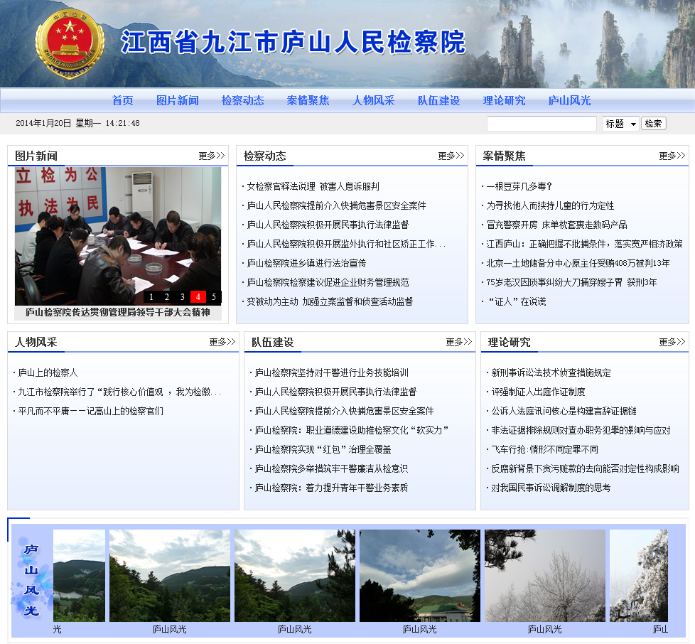 江西省九江市庐山人民检察院门户网站已于2013年12月25日开通上线了(http://www.jxlushan.jcy.gov.cn),庐山人民检察院网站是庐山人民检察院法制宣传的重要阵地,是检察机关与社会工作交流沟通的纽带和窗口,欢迎并感谢各界人士和广大公众对庐山检察工作提出宝贵意见和建议,促进庐山检察工作发展。